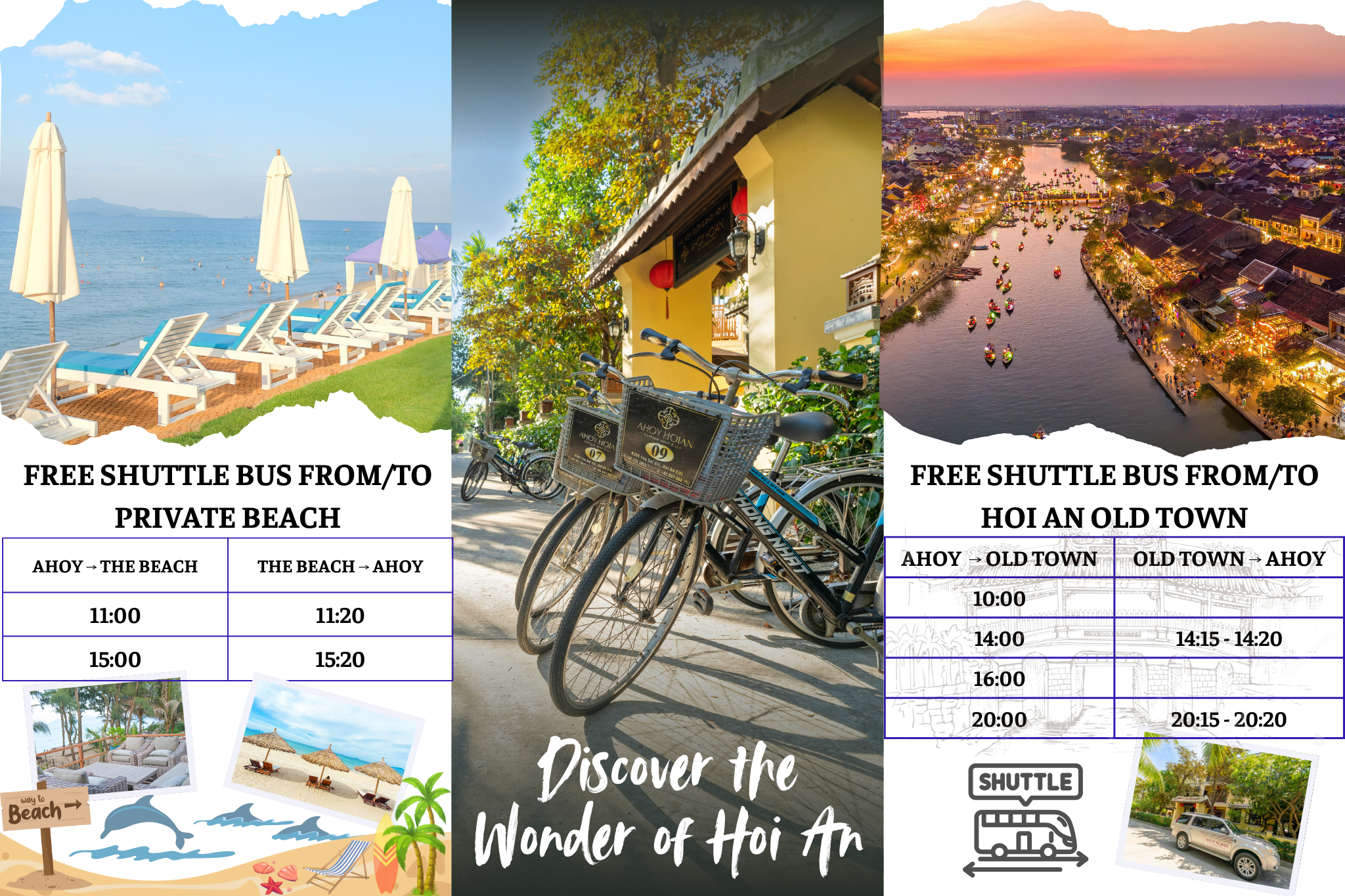 Discover the convenience of our complimentary shuttle service at Ahoy! We are pleased to offer our guests the Free Daily Schedule Shuttle Service to explore the charming Hoi An Old Town and the Private Beach.